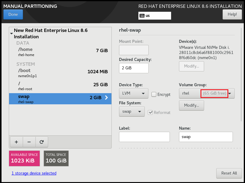 LVM 설정 중에 VG 설정 부분입니다. 옵션을 바꿔서 설정 외 남은 용량을 자동으로 VG에 할당하는 옵션입니다.
