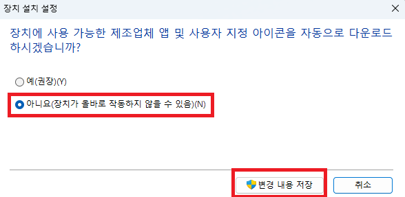 2. 하드웨어 - 장치 설치 설정(S) 클릭