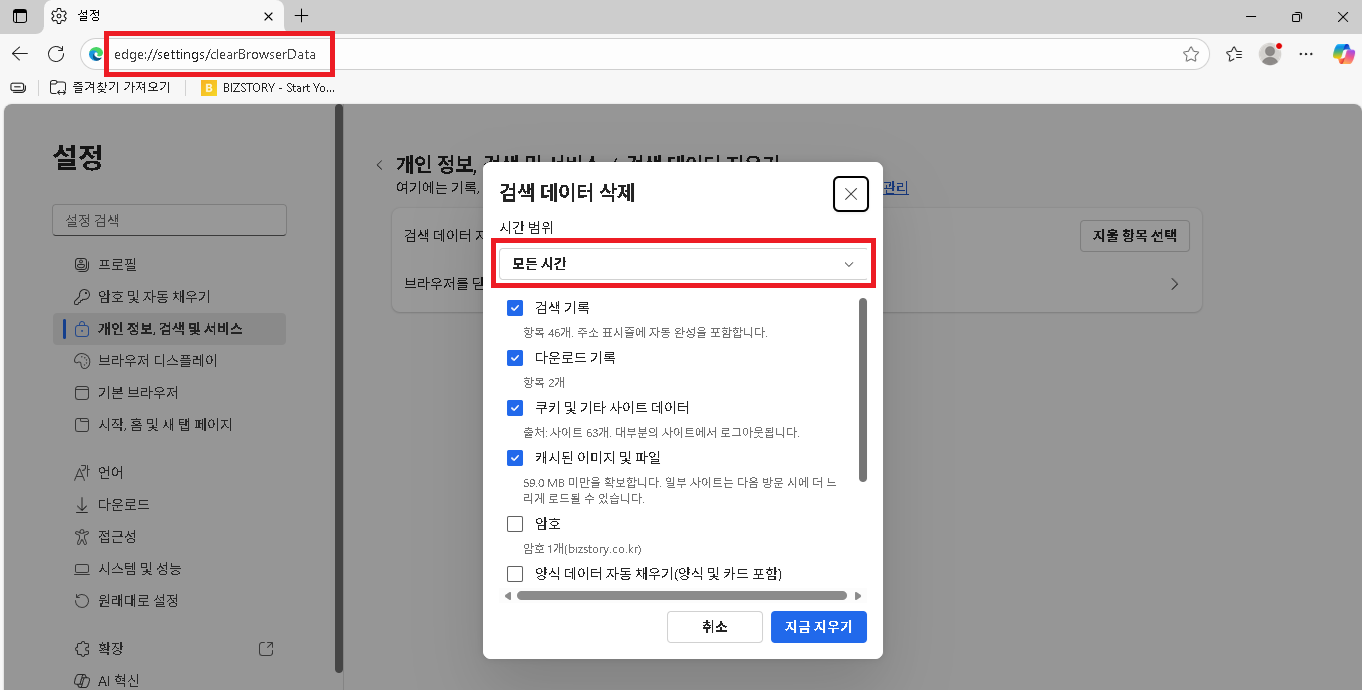 2. Edge 브라우저 검색데이터 삭제