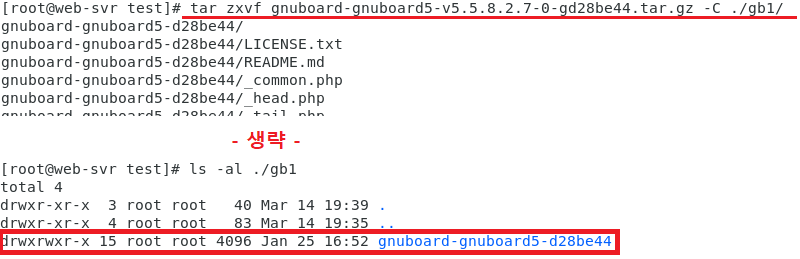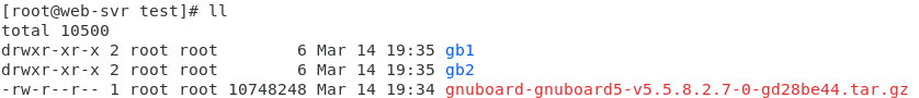 : test 디렉터리에 그누보드.tar.gz 파일을 gb1, gb2의 각각의 디렉터리에 압축 해제 진행
