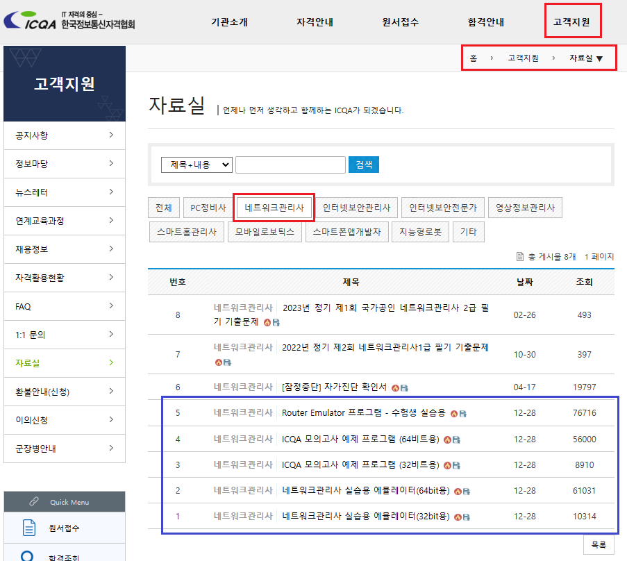 화면 중간의 [네트워크관리사] 박스를 클릭하면 아래 파란 박스 표시처럼 필요한 내용만 볼 수 있습니다.