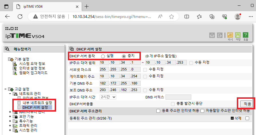 4. 공유기 관리도구 [ 고급 설정 → 네트워크 관리 → DHCP 서버 설정]