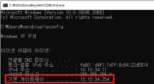 윈도 명령 프롬프트 창을 실행하여 ipconfig 명령어로 ip 환경을 확인합니다.