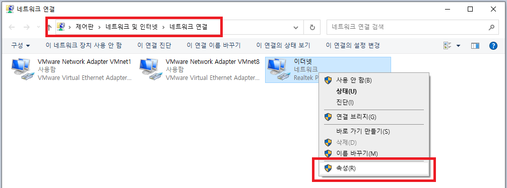 [네트워크 연결] 설정에서 [이더넷] 속성 클릭